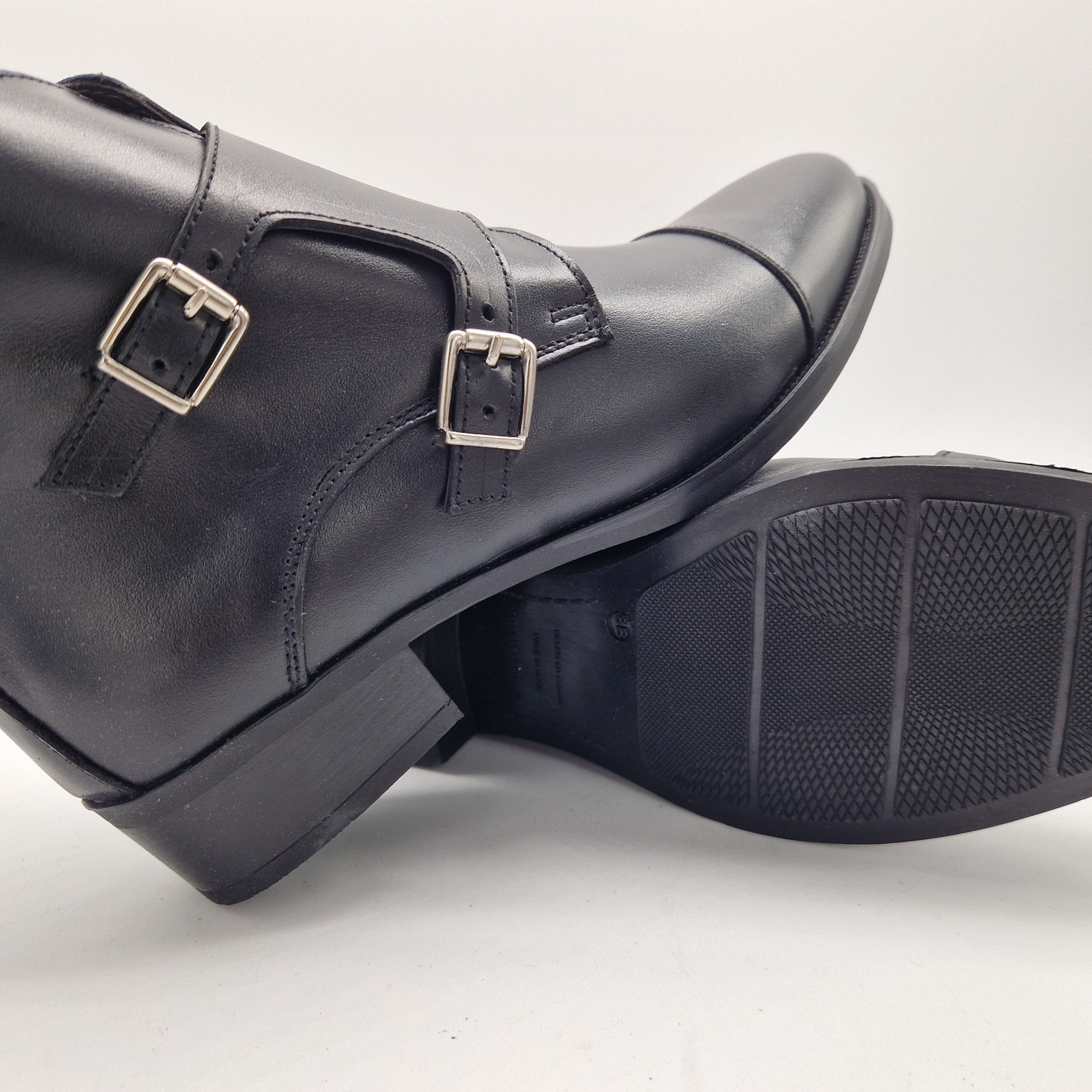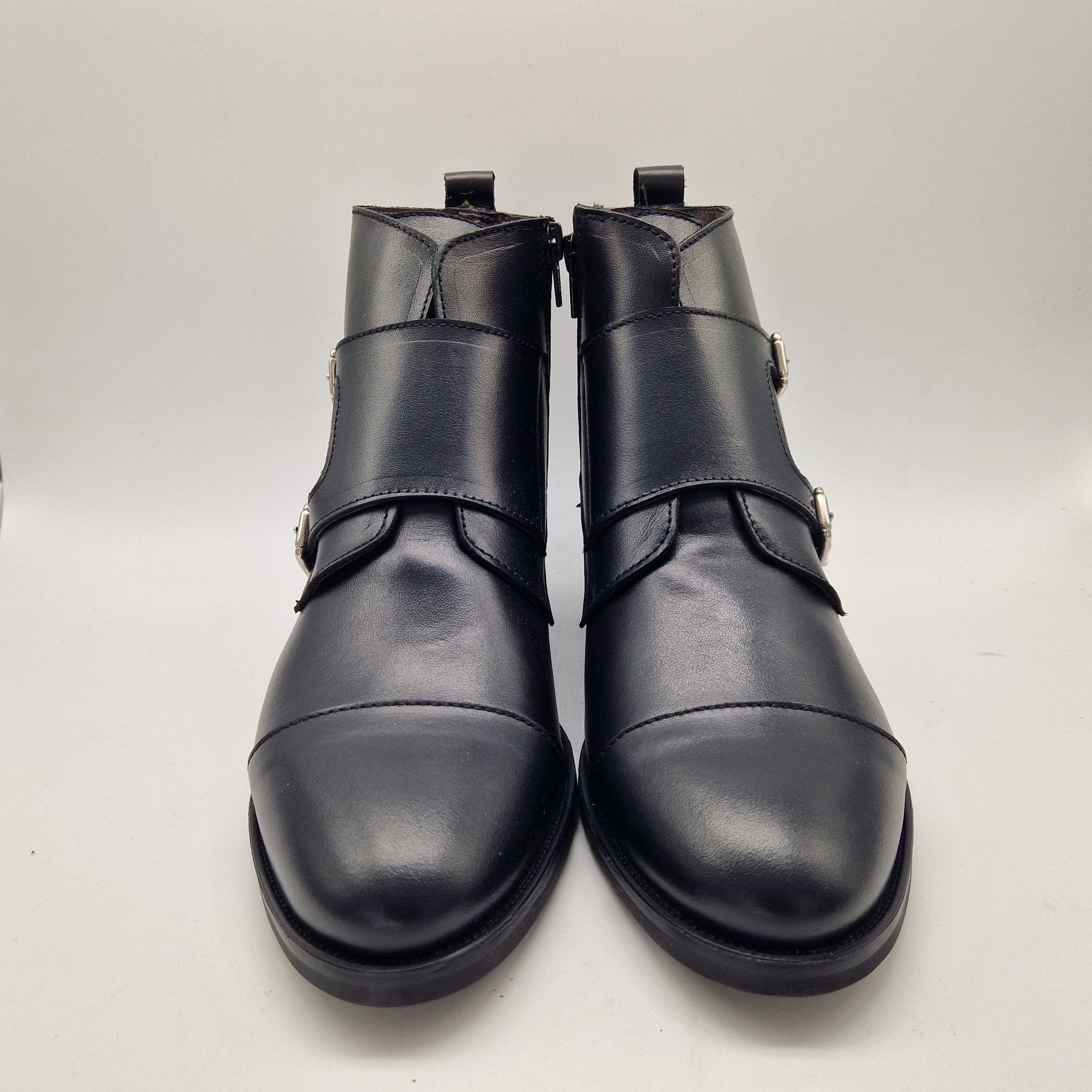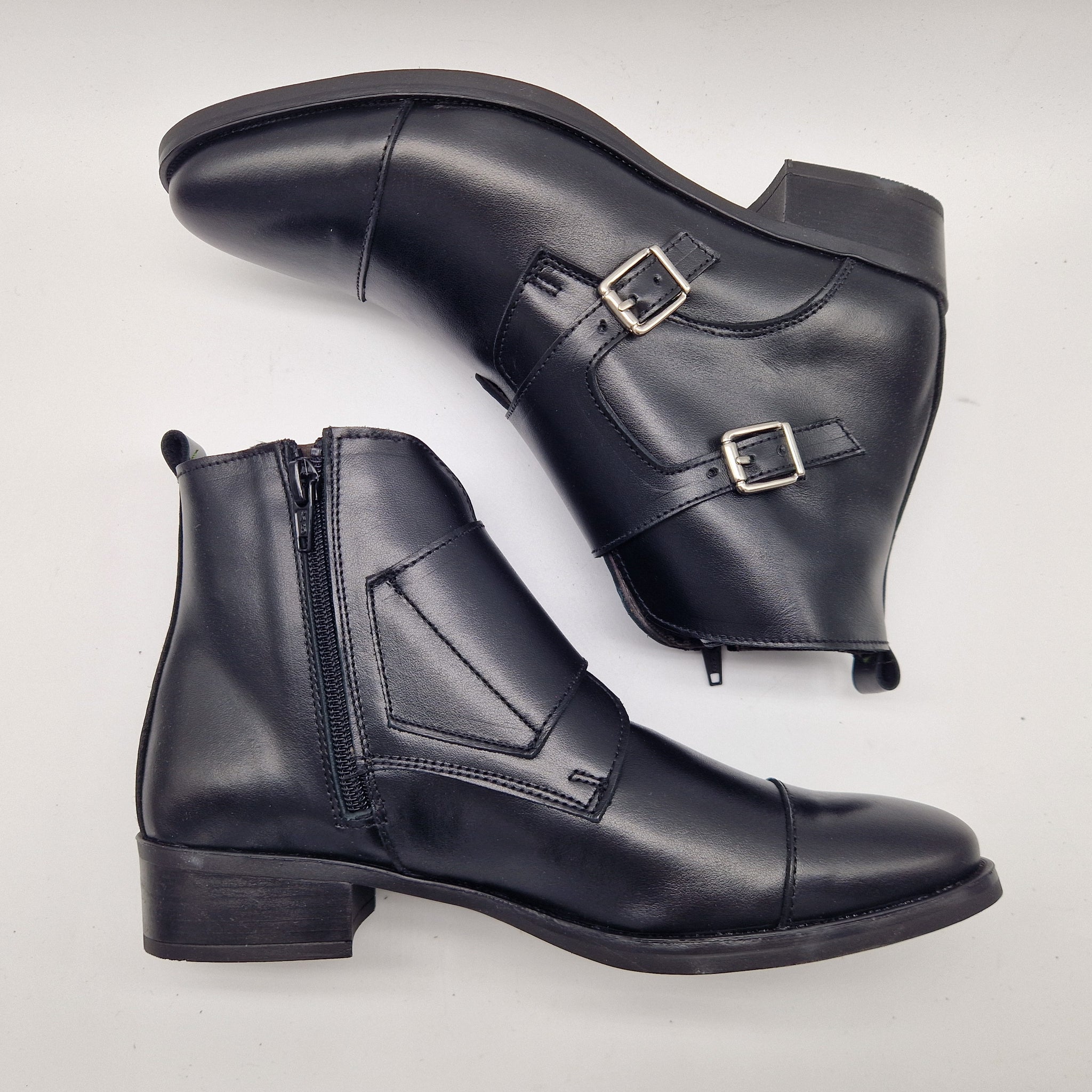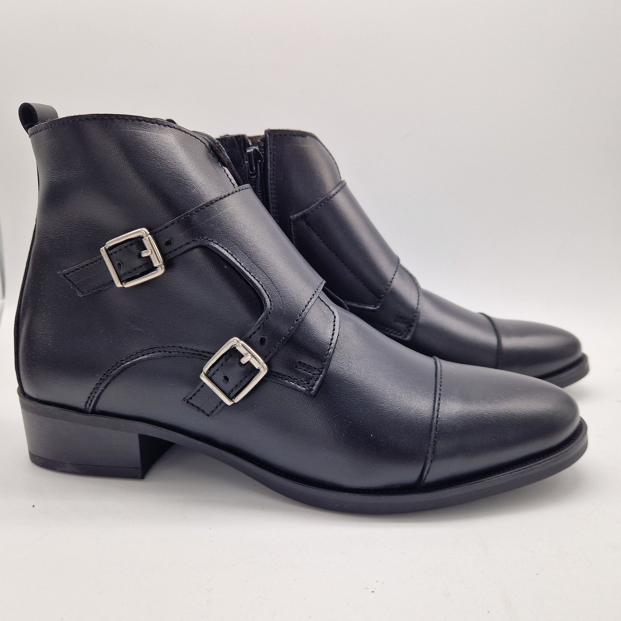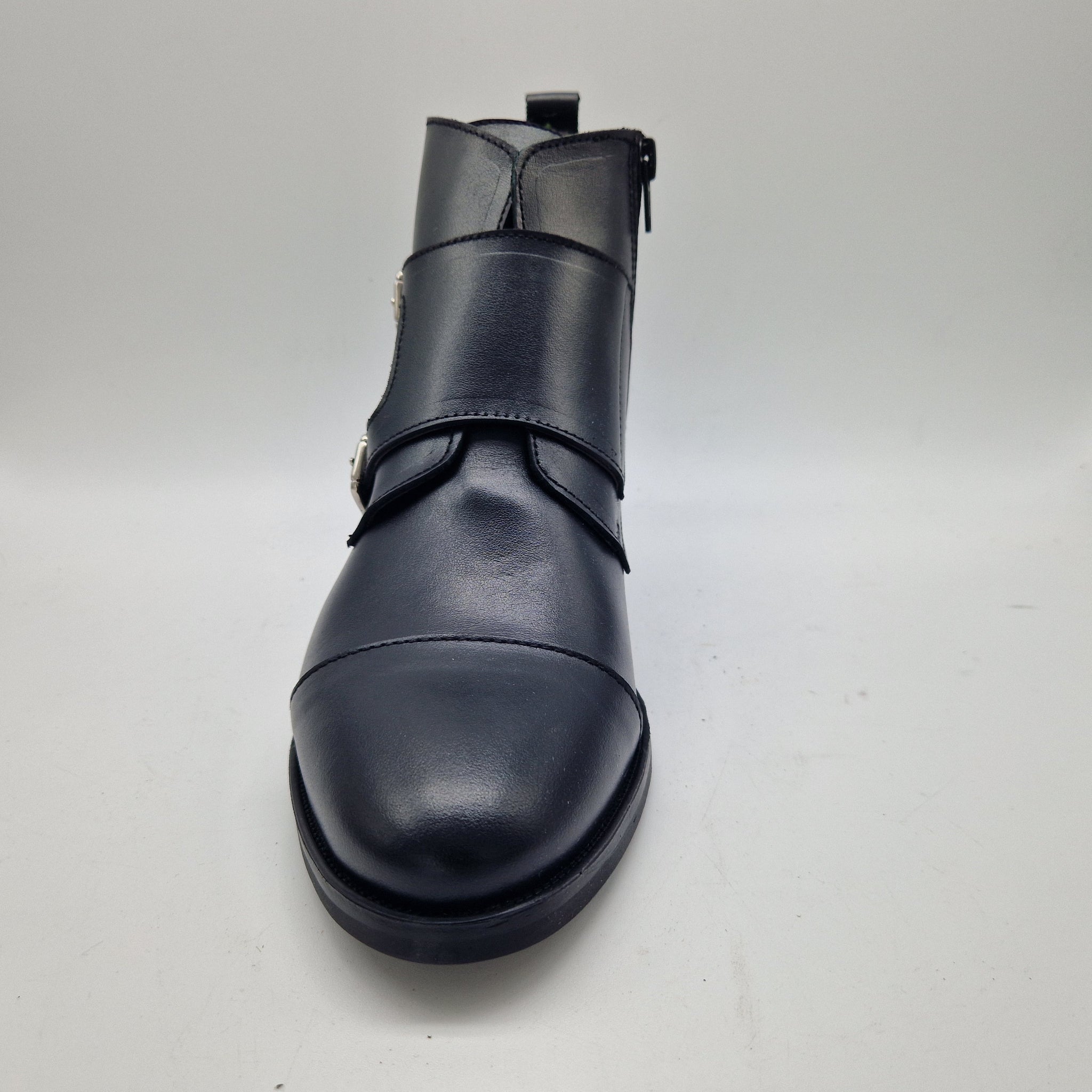 BOTÍN CON 2 HEBILLAS Y CREMALLERA EN PIEL NEGRA